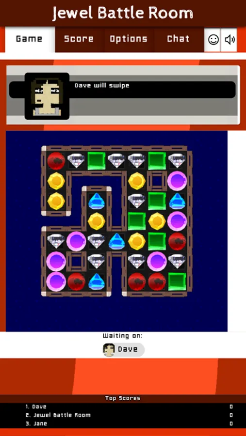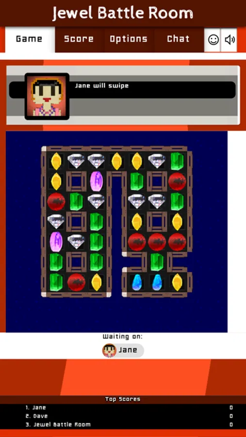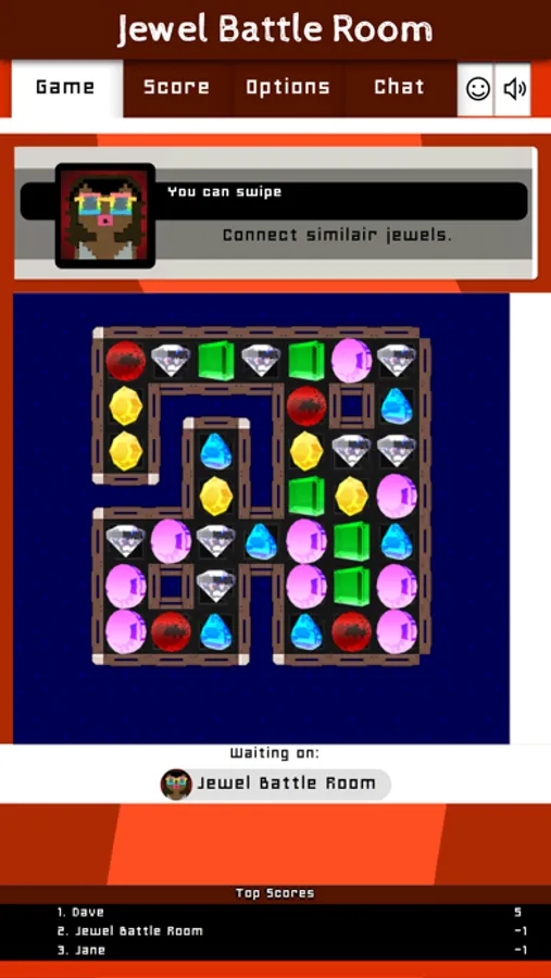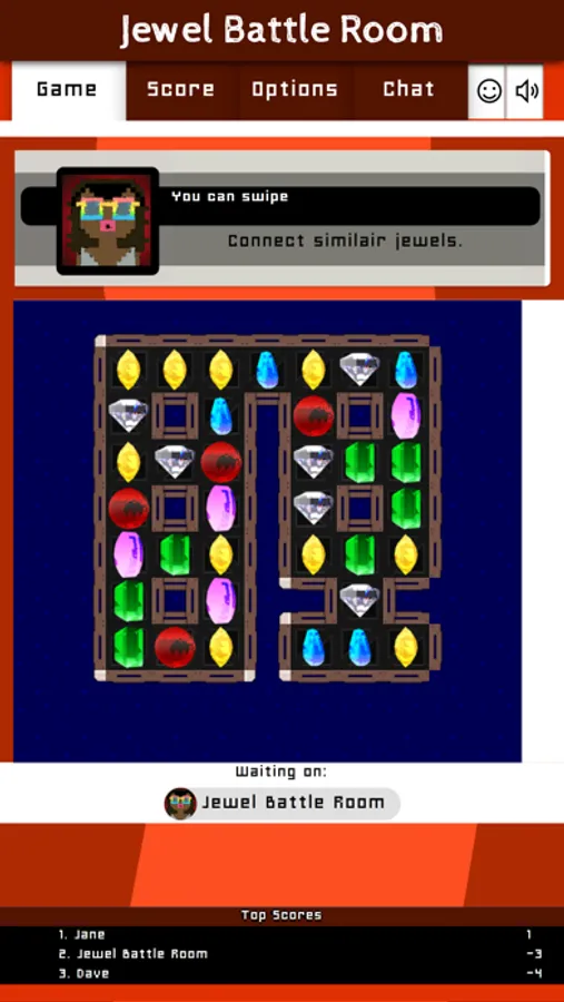Jewel Battle Room is a multiplayer game . The goal of the game is to swipe jewels to connect the same ones together. You can swap two adjacent jewels, by swiping over them. If you connect more then 3 together, you will earn points. The more jewels you connect at the same time, the more points you will earn. All connected jewels are removed and fall down.
