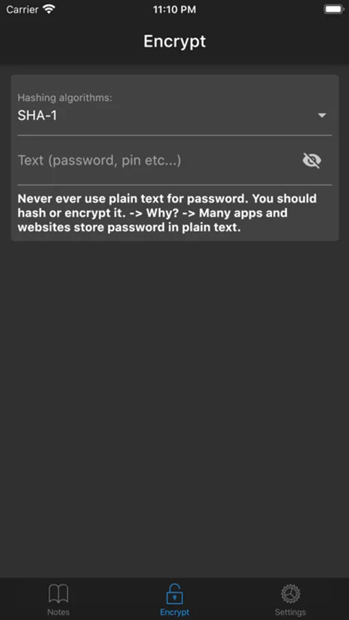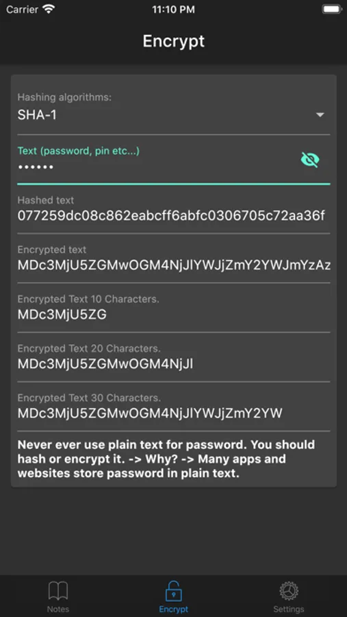 - Allows users to encrypt/ hash their password before using it in other websites or apps. This is because some websites or apps they don't encrypt the users' password on their server, instead, they keep it as plain text. So you should encrypt (or hash) your password before using it.
