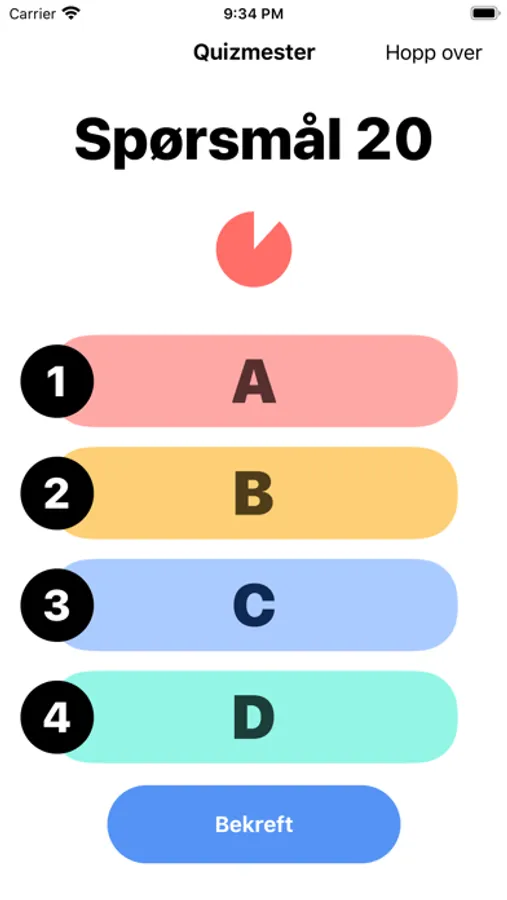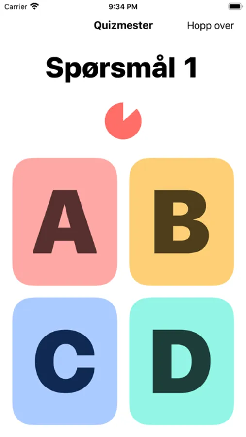 Når svaralternativene dukker opp i TV-programmet, må du selv trykke deg videre i appen. Du får da opp fire bokser med fire ulike farger og former, som tilsvarer svaralternativene du får i programmet. Trykk på den firkanten du mener er rett. Du har 10 sekunder fra svaralternativene dukker opp i appen til du må ha svart.