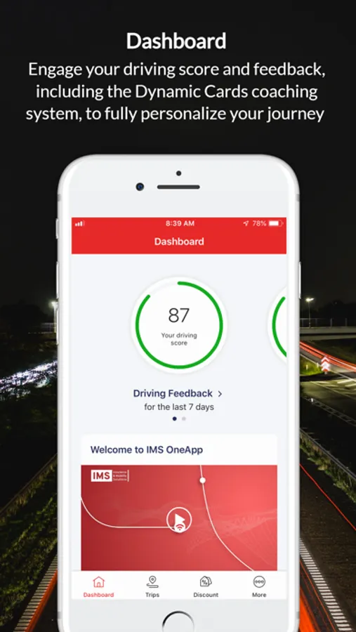 Download the IMS One App trial app to experience how users can improve driving behavior with a fully engaging and personalized experience that will improve your book of business. Experience how drivers can assess and improve their driving performance by actively highlighting risky driving behaviors including distracted driving, hard acceleration, hard braking, aggressive cornering, exceeding the posted speed limit, and more. In addition, users receive score trends and statistics that enable them to understand driving behavior improvements over time.