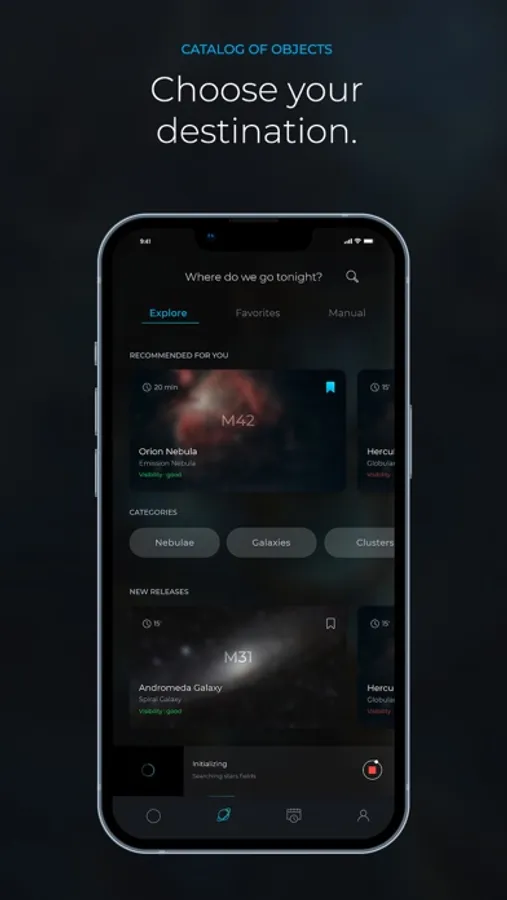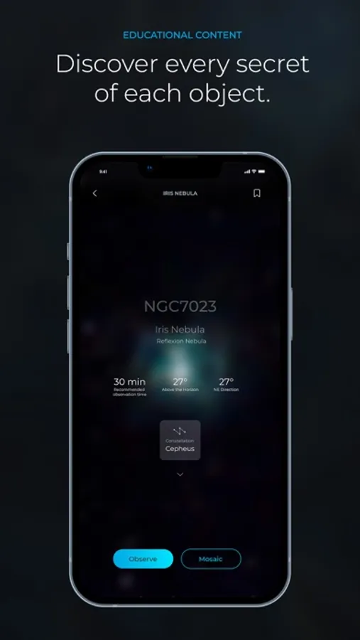 Receive personalized recommendations on which objects to observe according to your geolocation and the astronomical calendar.