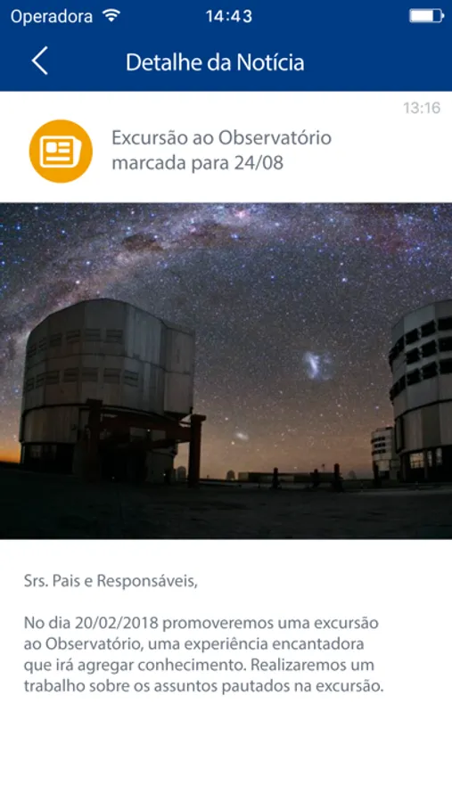 Com este aplicativo, os pais, responsáveis e professores poderão receber as últimas informações da escola, as notícias do dia a dia do seus filhos e o calendário de atividades escolares.