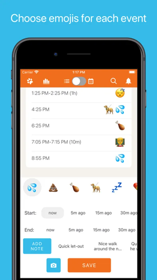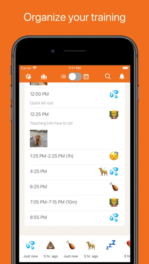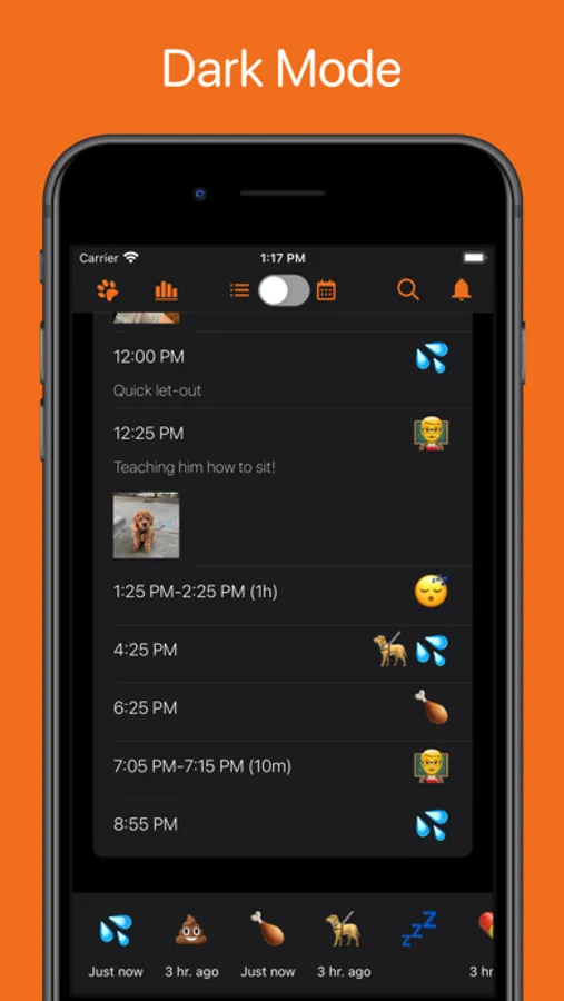 Quickly see when was the last time you took your dog out to go to the bathroom, the last time you fed them, the last time you gave them their meds, and whatever else you want to keep track of.