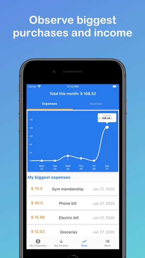 When it comes to managing your finances, keeping track of items and services you pay for is important. Costy allows you to manage your daily expenses and income with ease. Pick your currency. View, add, and edit your items using a calendar-like interface. Observe trends using the chart on the Stats page. Keep track of your biggest purchases and incomes. And never forget when and how much you spent on a particular item.
