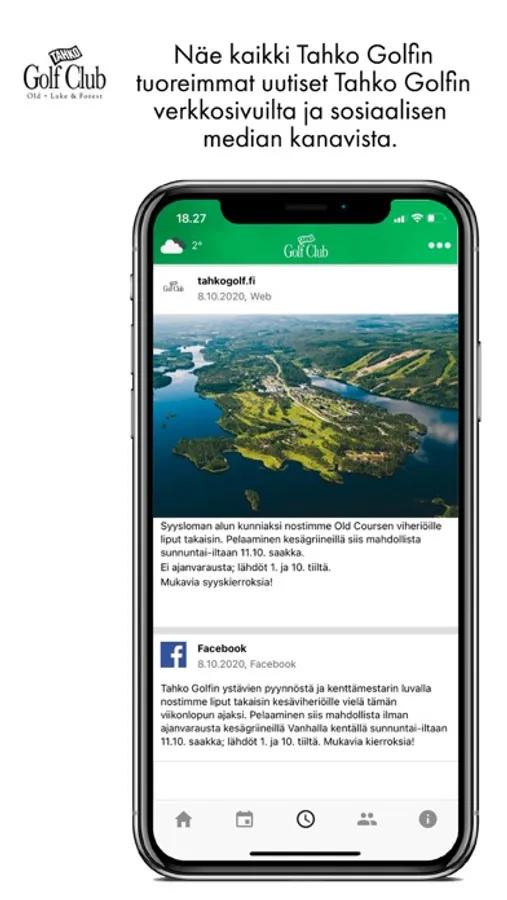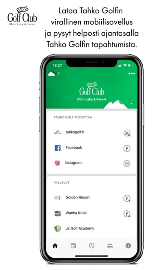 Sovelluksesta löydät kaikki Tahko Golfin tärkeimmät tiedotuksen ja sosiaalisen median kanavat sekä oheispalvelut ja yhteistyökumppanit.