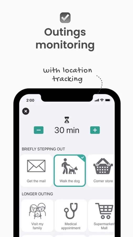 - OUTINGS MONITORING: Your parent can register their planned activities before leaving home and set their maximum expected duration. When back, they confirm being safely back home.