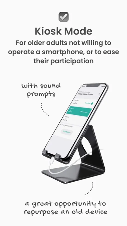 - OPTIONAL KIOSK-MODE: for parents not in the habit of checking their phone, or not familiar with using a phone or an app, you can use a dedicated iPod touch, iPhone, or iPad on a stand. This triggers special features that helps your parent successfully comply and also ease access to the app (no need to launch the app but just to touch the screen).