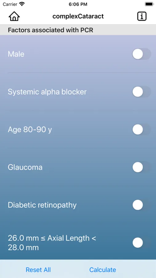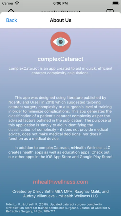 The scoring system utilized by this app is based on work published by Nderitu and Ursell in 2018 on cataract surgery complexity. This app allows for fast and easy calculations to use the suggested classification system, to potentially help minimize operative complications in ophthalmology training.