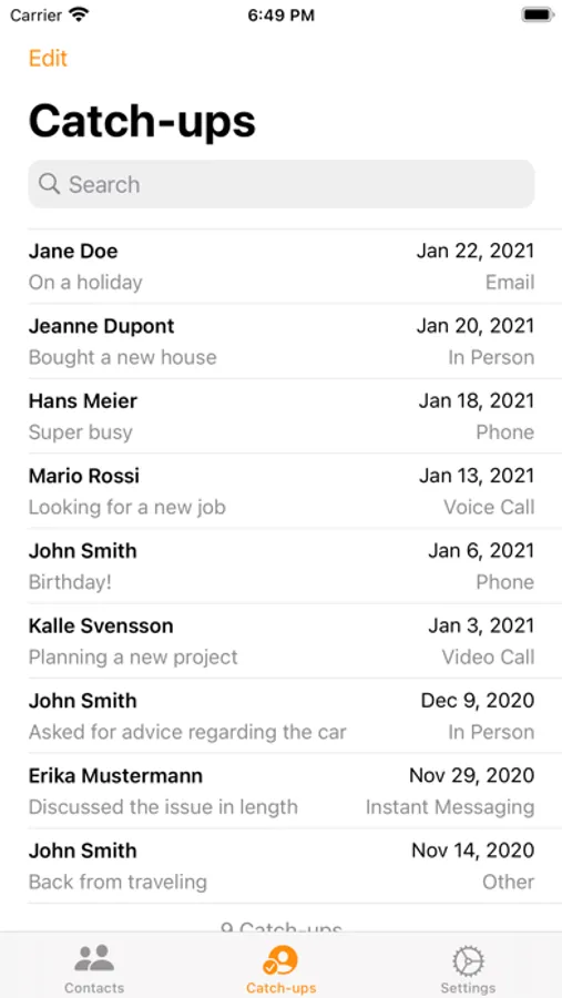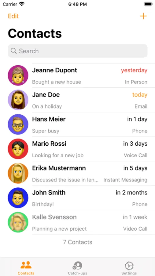 Kontaktr is a handy app helping you to stay in touch with your contacts. It keeps track of past catch-ups in a log book and reminds you when to reach out again based on a defined rate. A log entry consists of the date and type of the catch-up, additionally there is also the option to add a note.