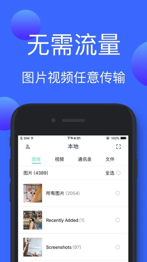两部手机无缝互联,无需网络,不耗费网络流量,免数据线隔空互传;照片、视频、通讯录、日历等可批量操作,一键传输;扫一扫快速连接,3步极速完成资料传输。