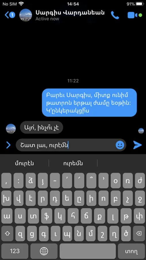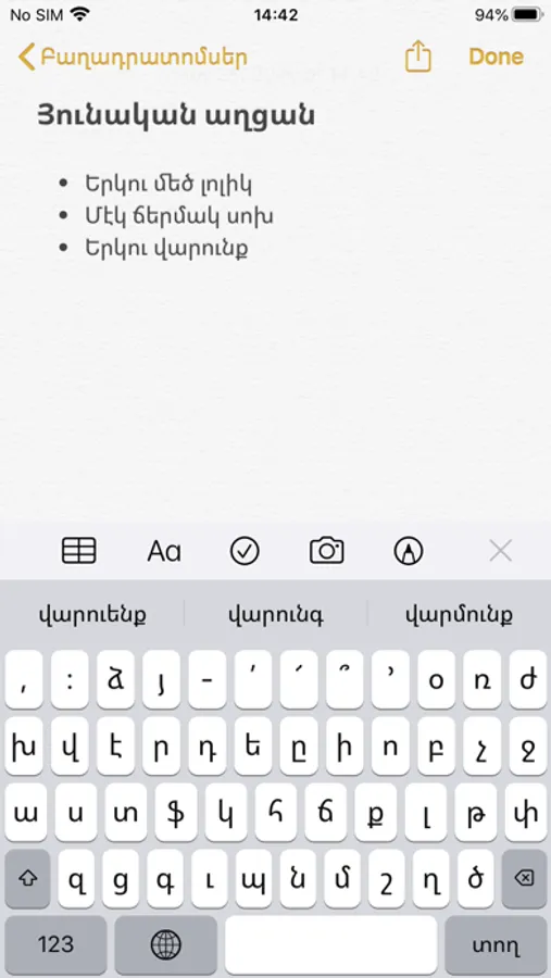 • Double-tapping the space bar adds an Armenian full-stop and space, and starts the new sentence in uppercase.