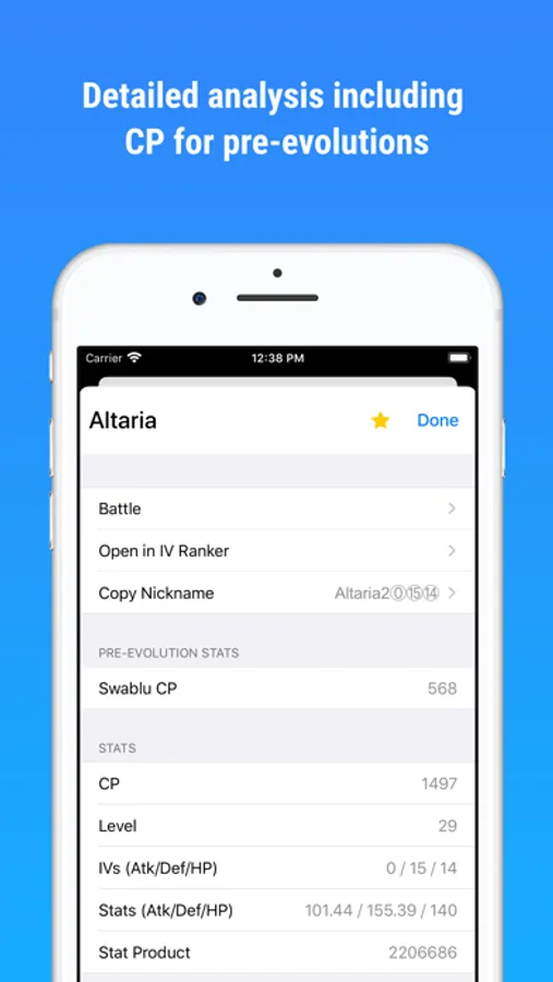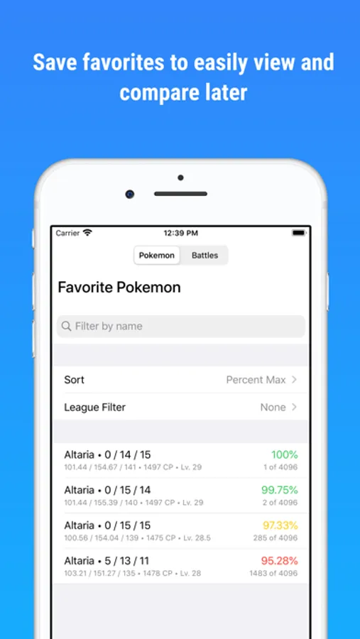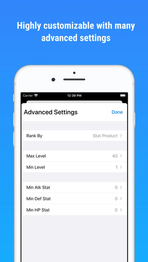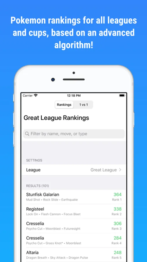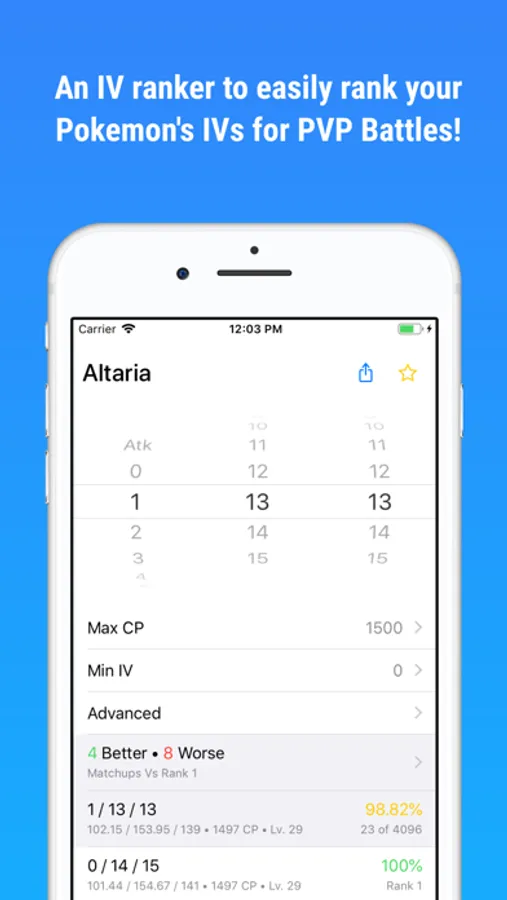 - Advanced settings to only rank Pokemon that meet a specific break point, and/or rank by CP, Level, etc. (instead of stat product).