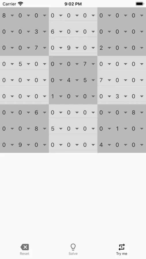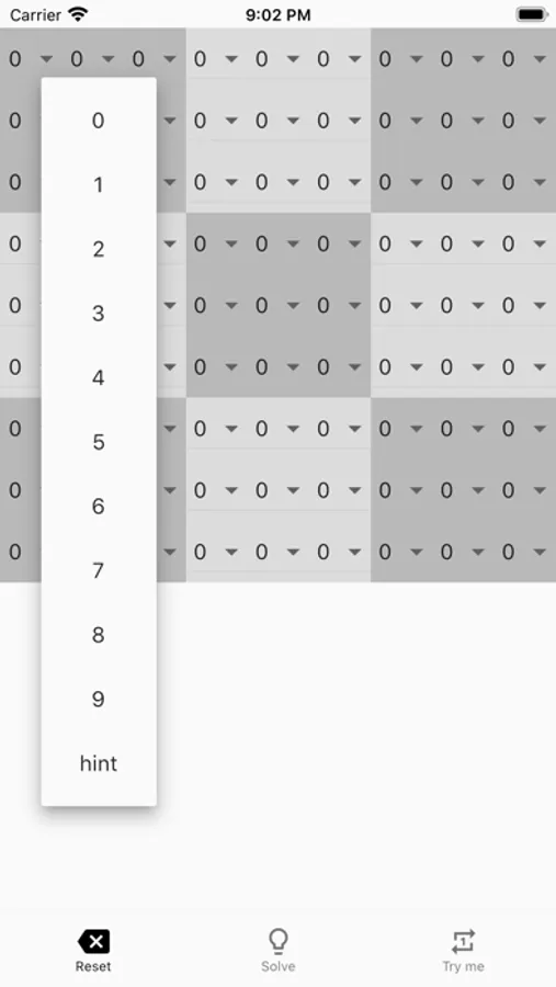 Select 'hint' from the dropdown to solve a specific number. Click on 'solve' in the bottom menu to complete the full sudoku puzzle.