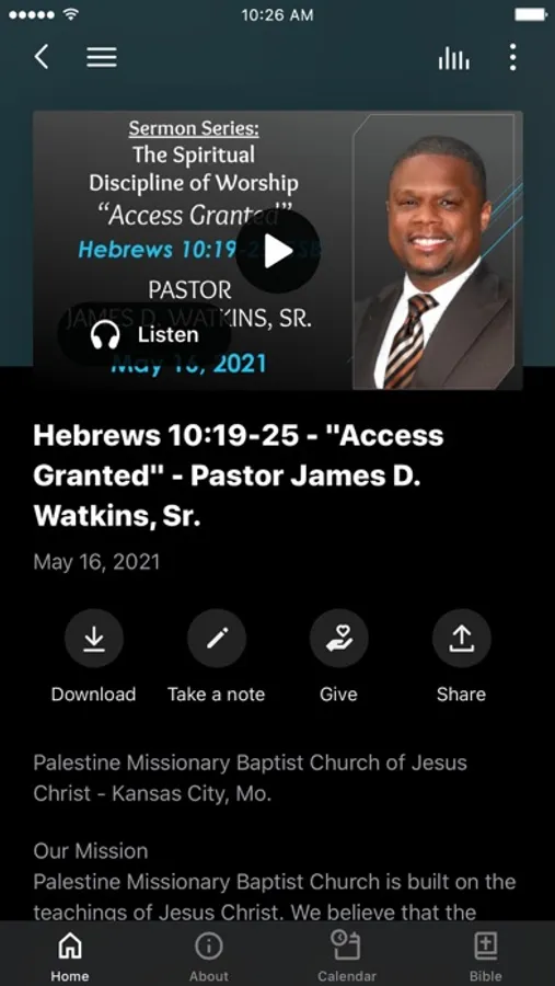 This is the official app for Palestine Missionary Baptist Church of Jesus Christ. This FREE app will help you stay connected with what's happening in our church. When you download the app, you can watch sermons anytime, view announcements, access online giving, and more.