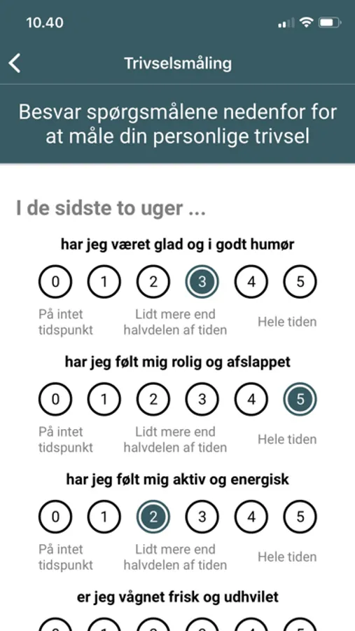 Din trivsel måles gennem WHO-5, som er et anerkendt mål for personers generelle trivsel eller velbefindende. Det består af 5 spørgsmål, som måler dit velbefindende de seneste to uger. WHO-5 anvendes på forskellige befolkningsgrupper og anbefales bl.a. af Sundhedsstyrelsen i Danmark.