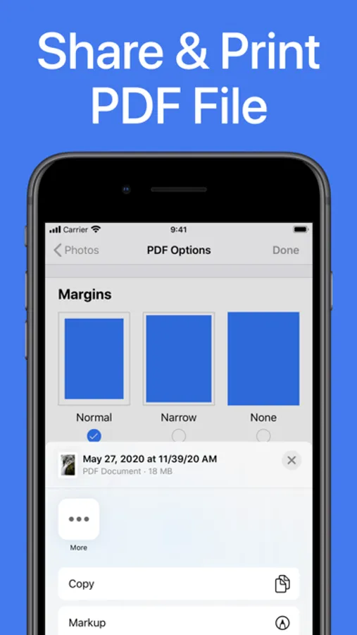 The integrated PDF converter turns your pictures or photos into PDF files. You can choose between different preferences for the page margin, orientation and size.