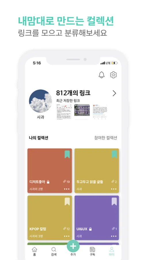 ① 개인/공개: 자신만 링크를 저장하고 다른 모야유저가 검색/구독할 수 있어요.