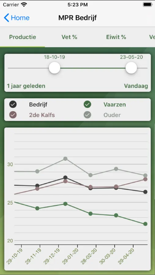 SmartFarming Dairy geeft inzicht in je productiegegevens. Dagelijkse productie per lacterende koe, belangrijkste parameters (vet, eiwit, somatische cellen, dagen lactatie, …). In één oogopslag kan u uw gegevens raadplegen en ziet u ook direct afwijking t.o.v. streefparameters. Attentiekoeien worden hierdoor sneller opgemerkt. SmartFarming helpt je uw resultaten te optimaliseren.