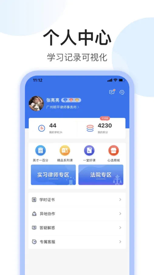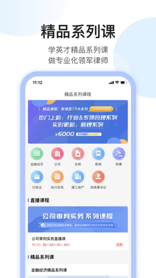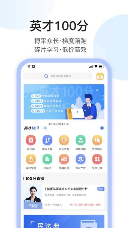 此APP功能分为英才100分(传道)、系列课程(授业)、答疑解惑(解惑)、个人中心等板块,从传道授业解惑角度出发,满足客户在移动端各个不同阶段相关课程及学习,同时对整体课程体系框架做了可视化呈现,进一步让客户直观的感受到公司整体的课程规划及具体服务。最大的吸引点在于同时兼顾课程的直播和点播观看,又搭建了学术交流分享的平台,满足客户的学习需求,加强了公司业务与客户的粘合度。为万千法律人搭建学习平台,潜心修行实现弯道超车