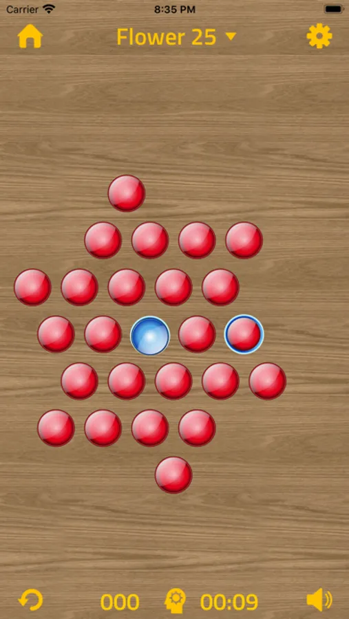 The objective of this traditional solitaire puzzle is to empty the entire board, except for a solitary peg. A valid move is to jump a peg orthogonally or diagonally over an adjacent peg into a hole two positions away. When a peg is jumped, it is removed from the board. When only one peg is left, the puzzle is solved