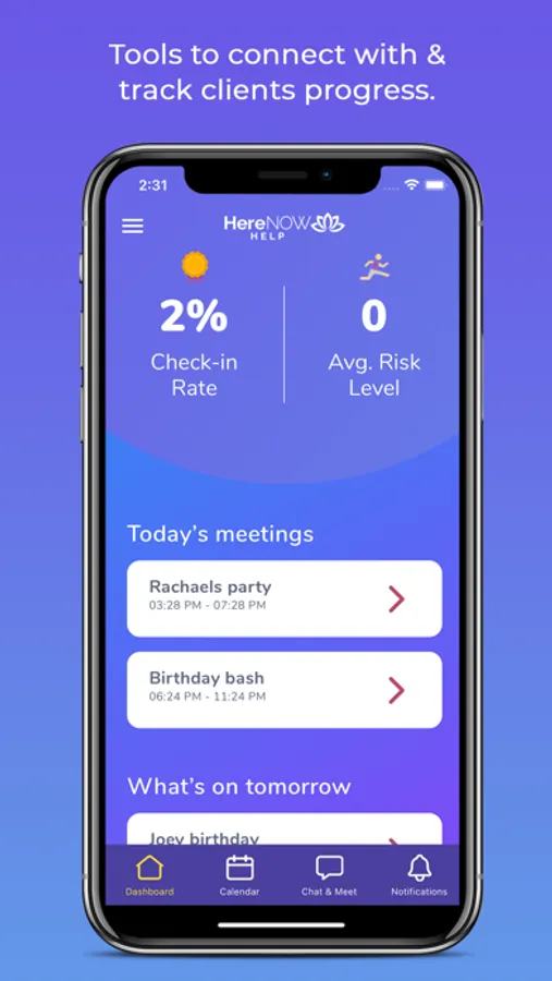 A mobile application from HereNOW Help that allows recovery support providers to better connect with and support their clients who are using our partner app "HereNOW". Connect via Chat, Call or Video. Send them custom surveys and track their progress. Get alerts when they enter high risk areas.