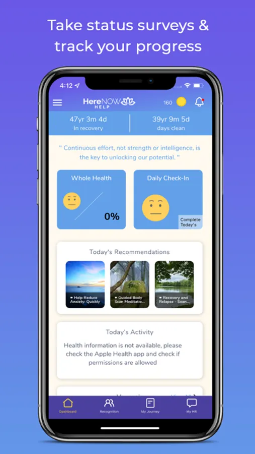 HereNOW Connect gives people in recovery the tools to either self-manage their recovery or connect with and receive support from recovery support providers who are using our partner app HereNOW Provider. HereNOW Connect enables you to track your own fitness via your Apple Watch, or iPhone with health tracking supported by Apple HealthKit so that you can monitor your health and recovery goals under one roof.