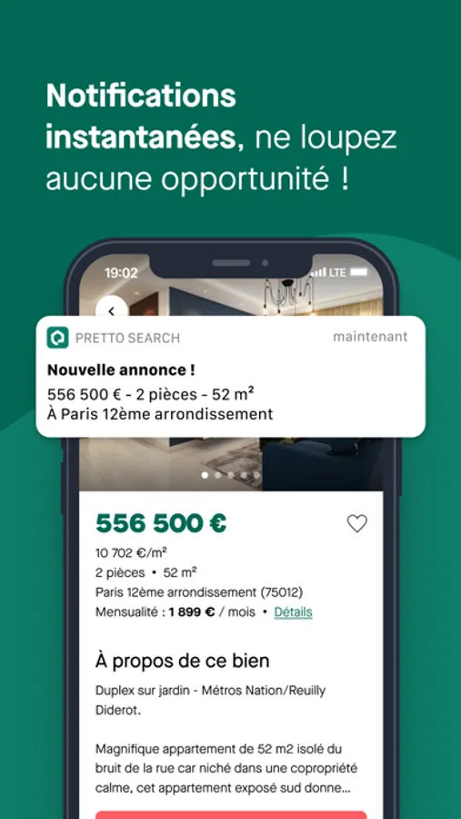 Grâce aux notifications push en temps réel, vous recevez les annonces immobilières dès qu’elles sont publiées, sous 10 à 15 minutes. C'est parfois plus rapide que les sites eux-mêmes ! Soyez le (la) premier(e) à visiter et à faire une offre d’achat sur le bien de vos rêves !