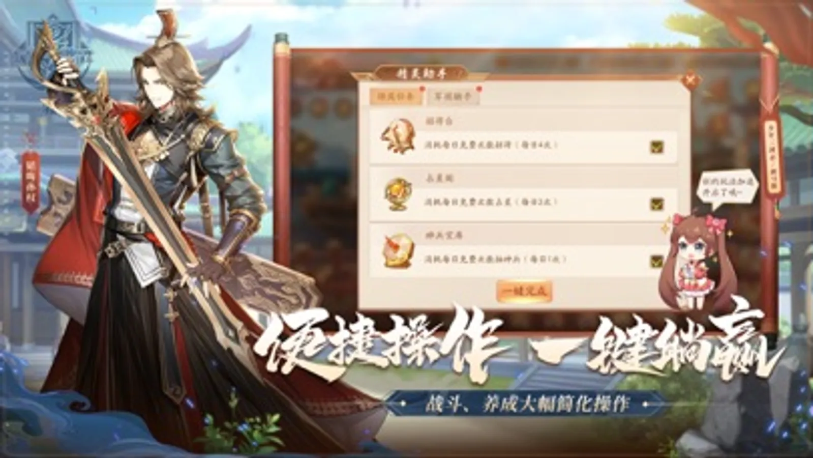 游戏独创神将传玩法,该玩法融合了RPG元素,让卡牌也可以自由走位,让你尽情探索副本地图。同时,你还可以化身成赵云、吕布等传奇神将,重温史诗级的经典战役,亲自书写专属于你的三国故事!