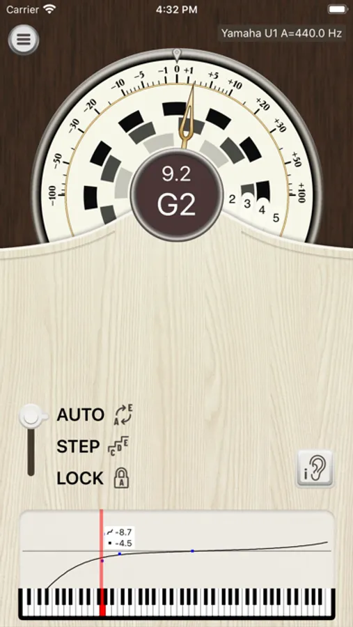 • Swipe in the graphing area to show a live frequency spectrum or the inharmonicity of measured notes.