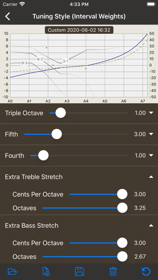 • Custom tuning styles: create a custom tuning curve by adjusting interval weighting and stretch