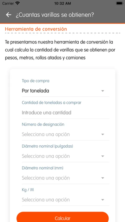 - Conoce cuantas varillas obtienes por pesos, metros, rollos, atados y camiones dependiendo del calibre que elijas.