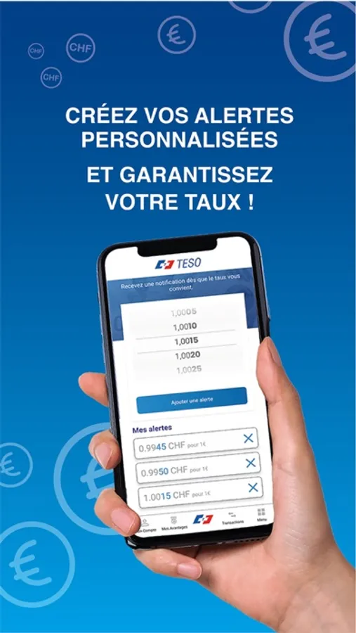 TESO vous permet de paramétrer des alertes pour être averti du taux de change auquel vous souhaitez transférer votre argent. L’application vous permet de consulter le taux CHF/EUR sans même être connecté avec un compte.