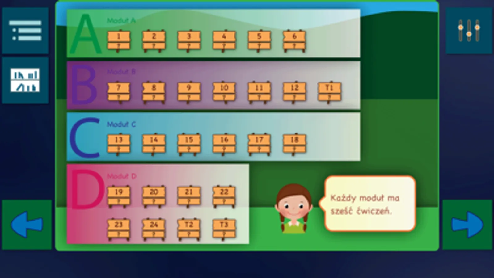 Struktura aplikacji oparta jest na zasadzie „Poznaj – utrwal przez ćwiczenia – pokaż co potrafisz”.