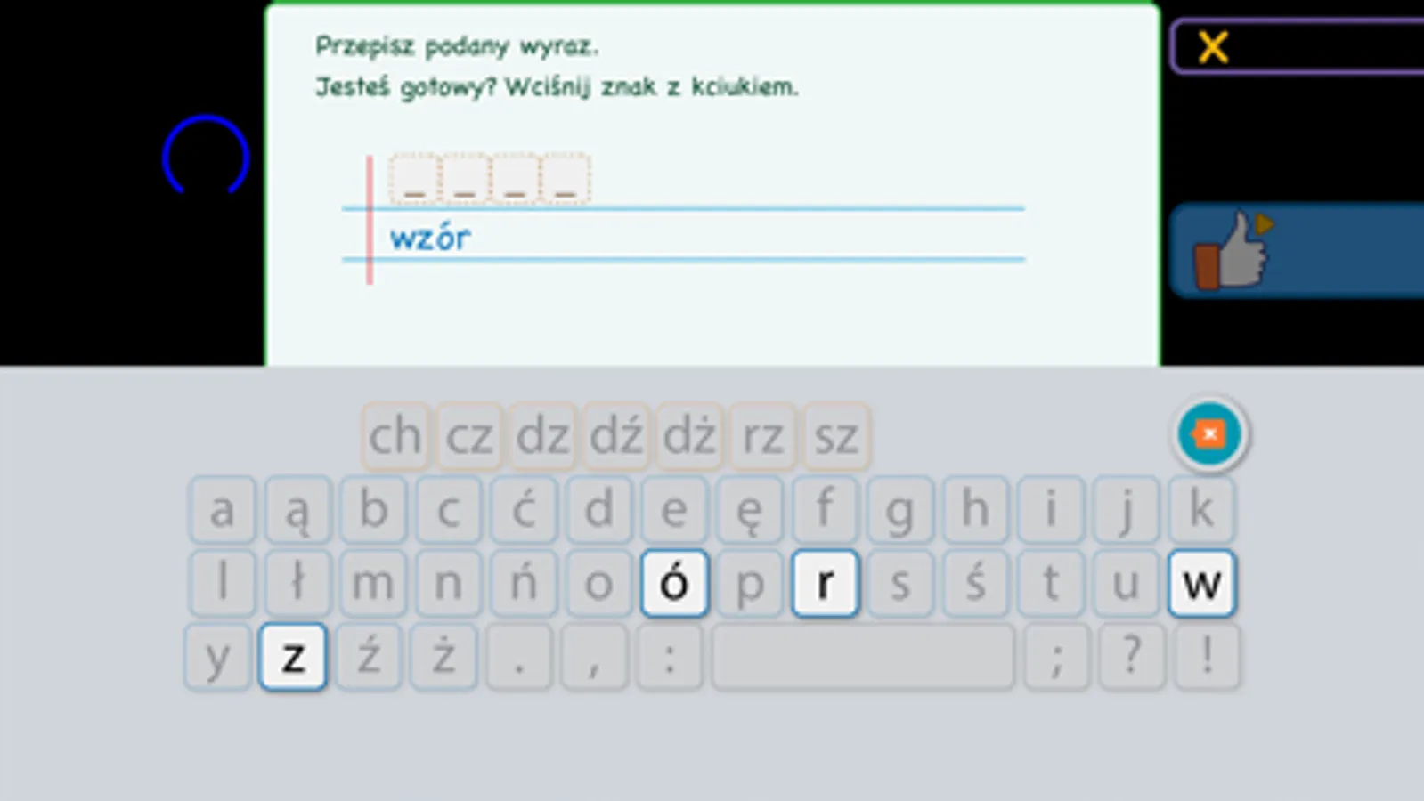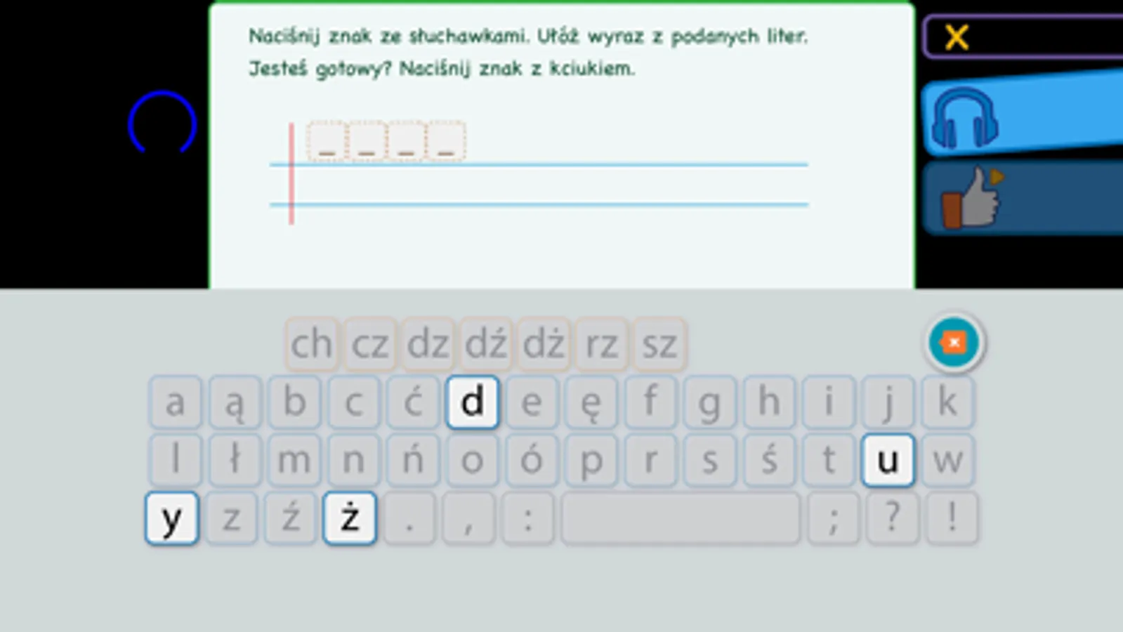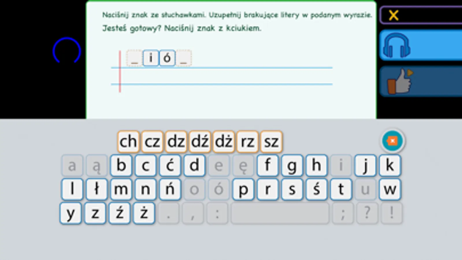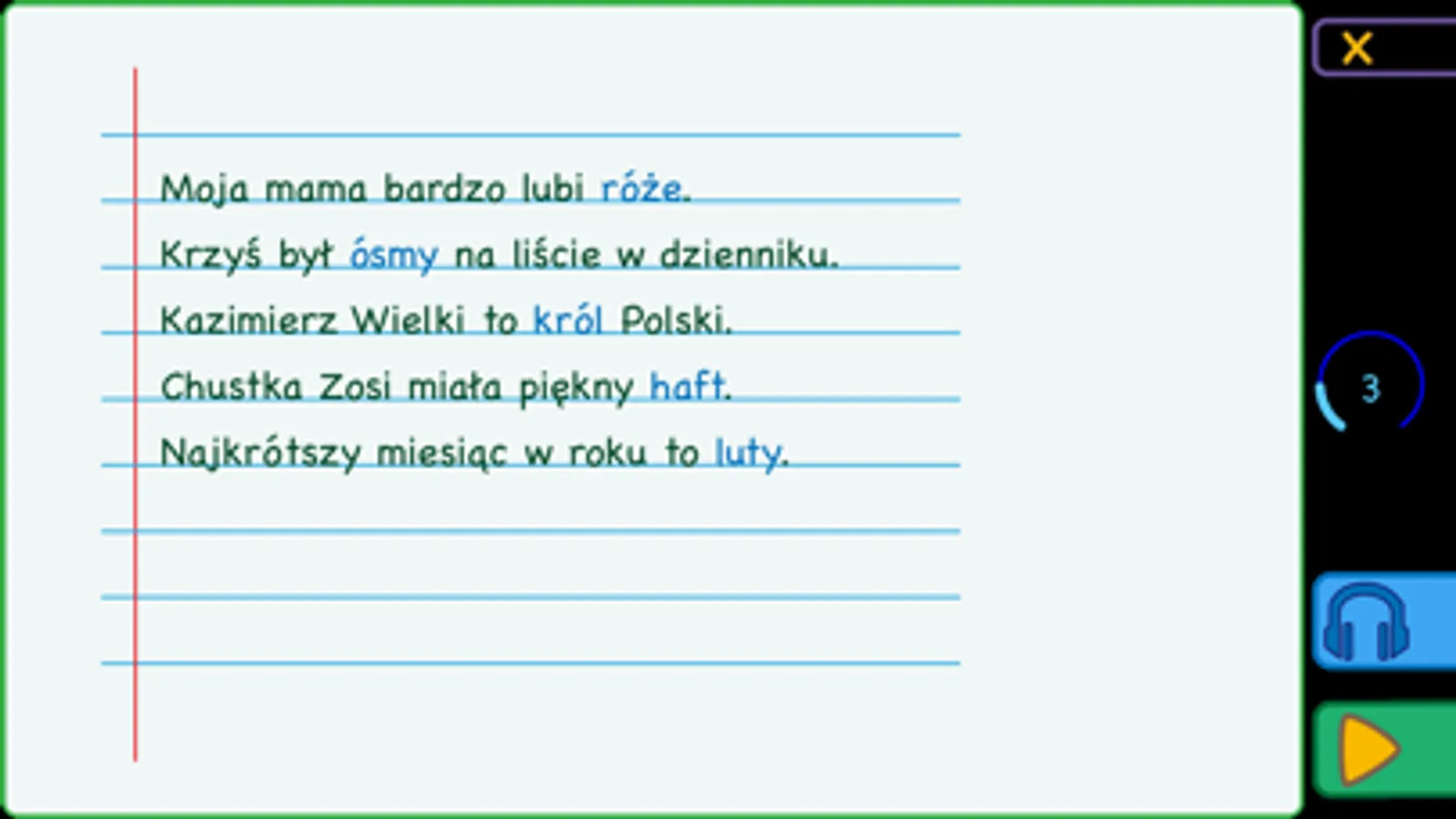 - Pisanie ze słuchu. Przy błędnym napisaniu wyrazu, pojawi się poprawna odpowiedź.