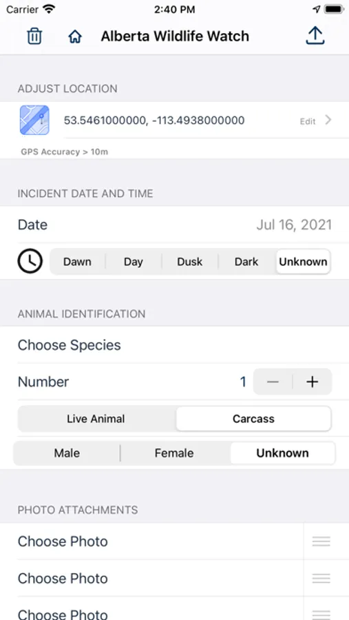 The 511 Alberta Highway Reporter is used to report Wildlife, Road Status, Damage Feature, and Road Condition events.