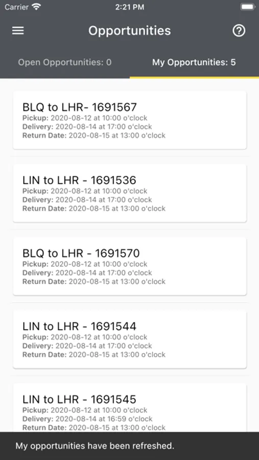 The application notifies when a new opportunity is created through push notifications. Then the user can choose to accept the opportunity. By accepting work, the user may review collection and delivery information.