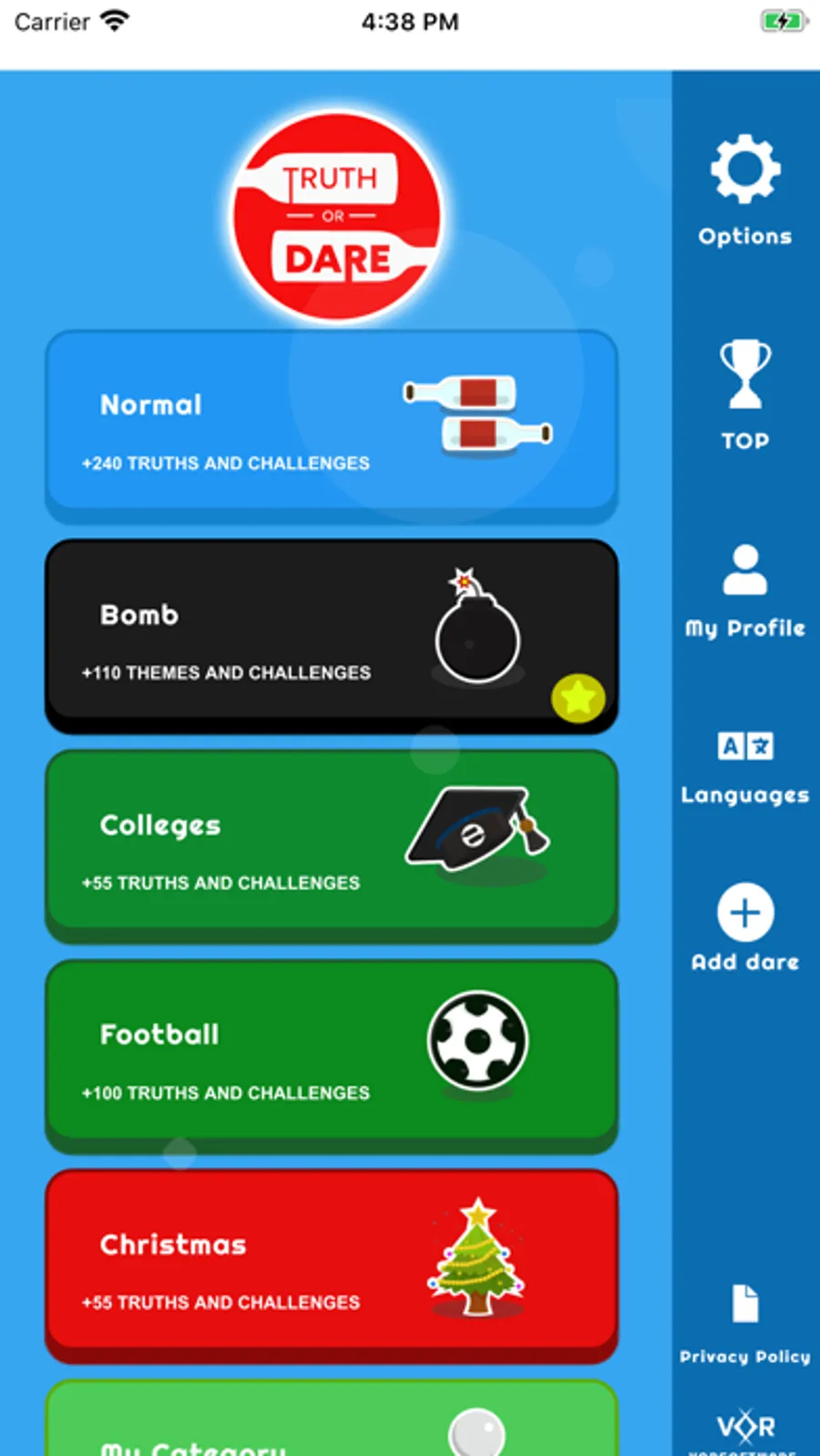 A new way to play the classic game, Truth or Dare, with hundreds of challenges and with categories ranging from normal to the most daring and spicy