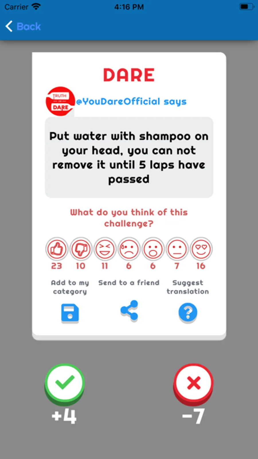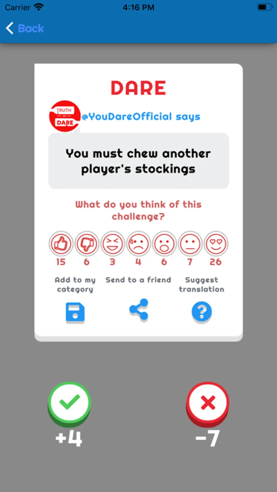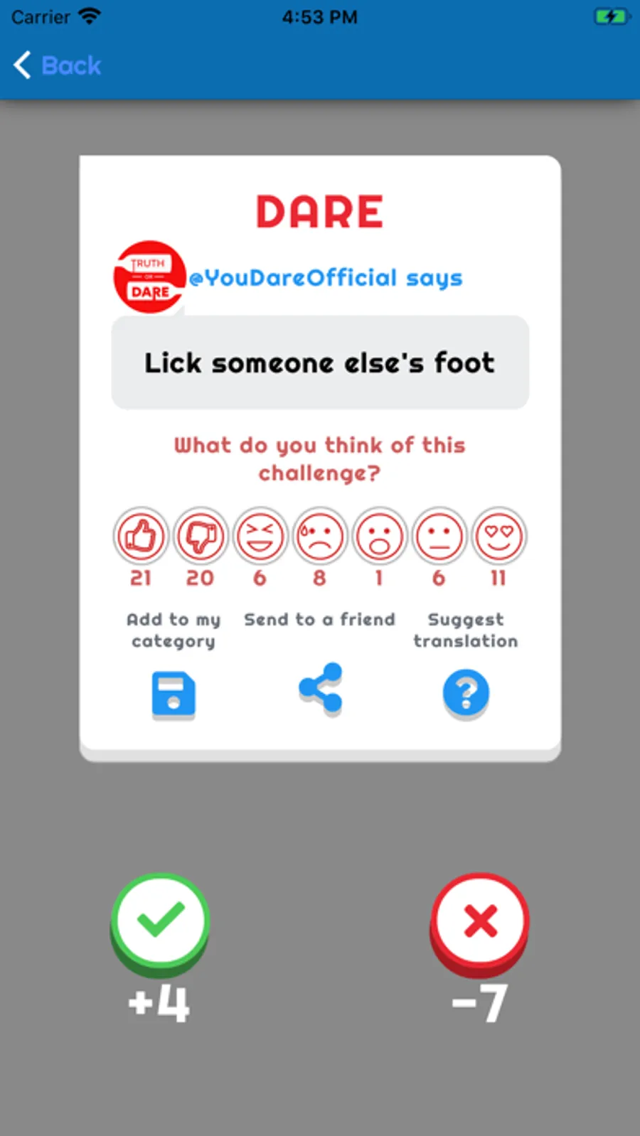 • Suggest your own truths and challenges, so that we can add them to the game (new ones are added every day).