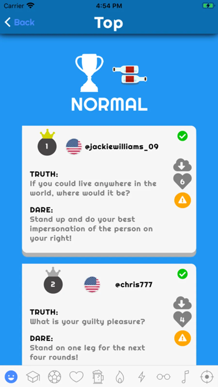 Our company is not responsible for the consequences of the truths and challenges created by the players in this application. Players must complete the challenges at their own risk. The challenges contained in the app (except normal), challenges created by users on their devices and those located at the top, can be omitted if it represents a physical and moral risk, as well as damage to other people or to itself.