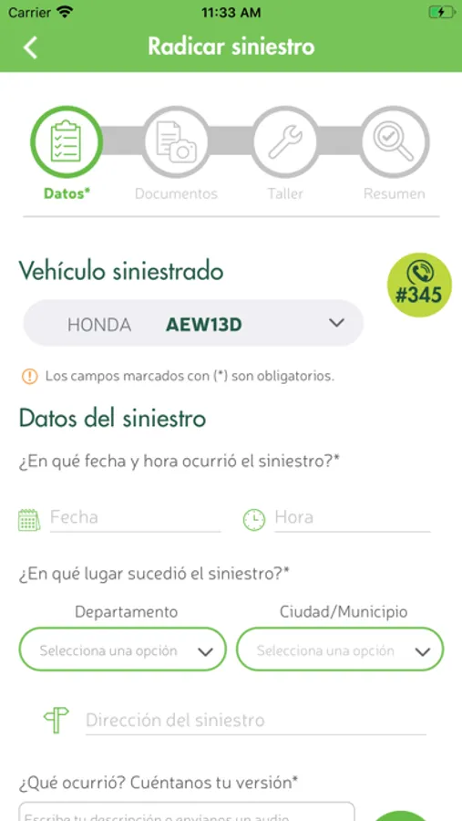 Radicar un siniestro es tan fácil que puedes hacerlo en pocos pasos: comienza completando los datos básicos de lo sucedido en el siniestro, luego incluye las fotografías de los documentos y evidencias que desees, para finalmente visualizar el resumen de la información que registraste y realizar la solicitud de radicación.