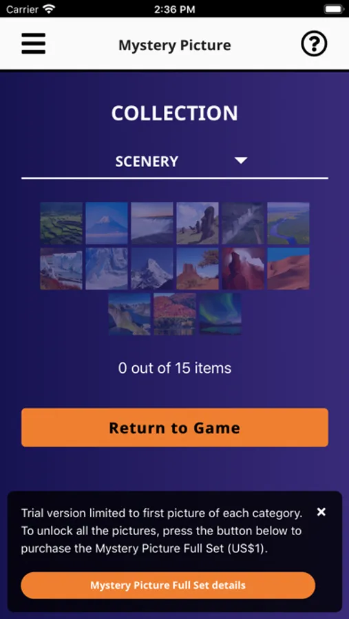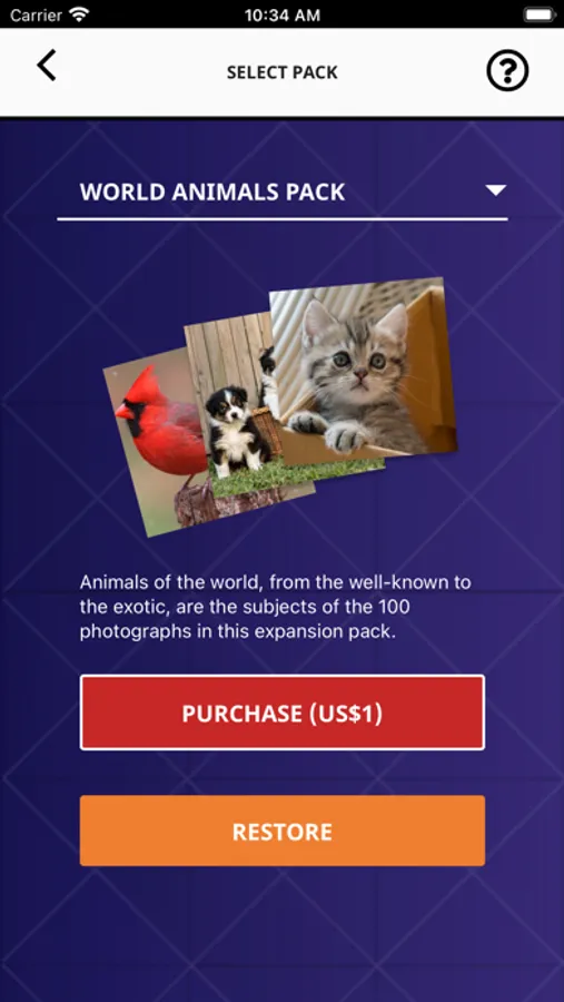 There are 20 pictures in the free version, and a total of 200 distinct pictures if you make an in-app purchase of the Mystery Picture Full Set expansion pack. Additionally, the other expansion packs (World Animals, Heritage Sites, World Travel and Transportation Vehicles) can be purchased to add a further 100 specialty images each.
