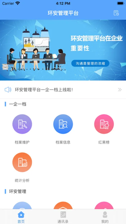 环安监管平台是为政府部门和企业设计打造的一款在安全和环保管理领域应用的平台,平台主要包括组织架构、一企一档和环安管理模块。一企一档用于建立企业档案信息,将全镇企业汇总到平台当中,方便政府通过平台对全镇企业进行查看,并通过可视化的方式多维度的对全镇企业进行统计分析,方便掌握了解全镇的企业情况;环安管理模块用于各个网格对区域内的企业定期定点巡查,通过流程化的方式发现问题、上报问题、整改问题、核查问题和办结问题。企业也可以通过平台对自身存在的问题进行记录和整改,方便政府对企业存在的问题进行了解跟踪,保障了安全、环保问题早发现、早处理,早办结,防患于未然。这种将政府监管和企业自查相结合的方式,落实了企业的主体责任,加强了对执法人员的监管,提高了管理效率。