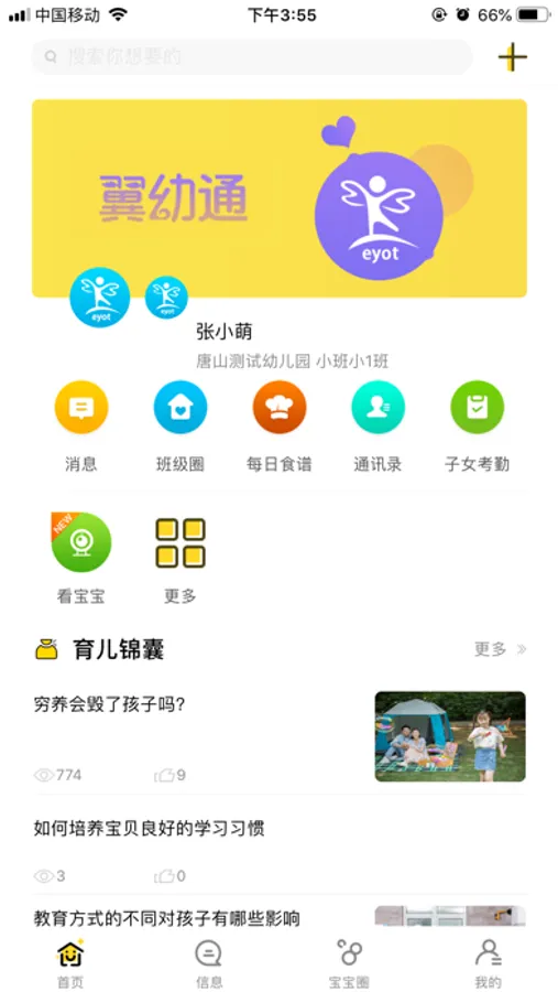 翼幼通以电信宽带网络为传输通道,通过考勤机、摄像机为信息采集终端,集互联网多种技术于一体,向幼儿园用户提供学生考勤、看宝宝、班级圈、每日食谱、消息等功能。用户在家中通过翼幼通即可远程观看宝宝在园动态,与老师沟通宝宝在园学习生活情况。