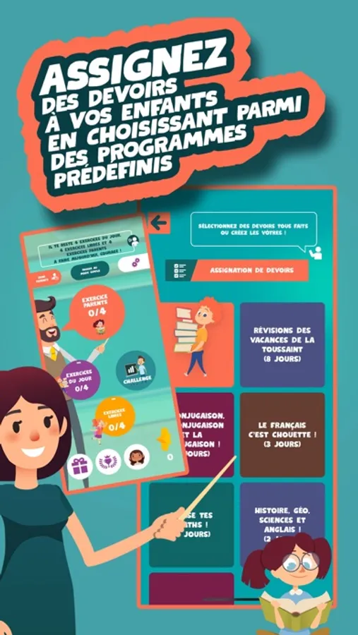Grâce à la partie 'assignation de devoirs' vous pouvez assigner des exercices spécifiques à vos enfants pour qu'ils travaillent un point particulier du programme. Des devoirs tous faits sont aussi disponibles, ces devoirs se déroulent sur plusieurs jours (4 exercices par jour à faire) et font travailler les enfants sur des points précis ou abordent divers sujets pour réviser pendant les vacances par exemple.
