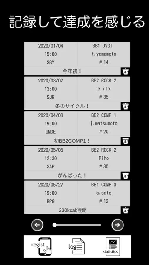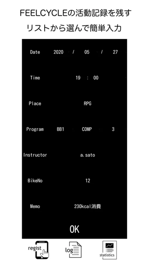 ・受講日時、プログラム名、インストラクター名、バイクナンバー、メモの登録