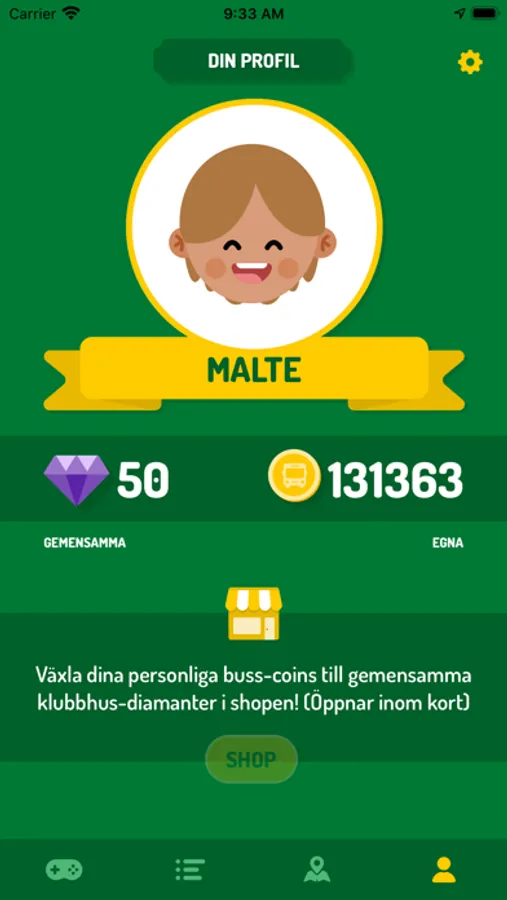 - Samla in diamanter och mynt genom att spela spel och vara delaktig i Bussklubben.