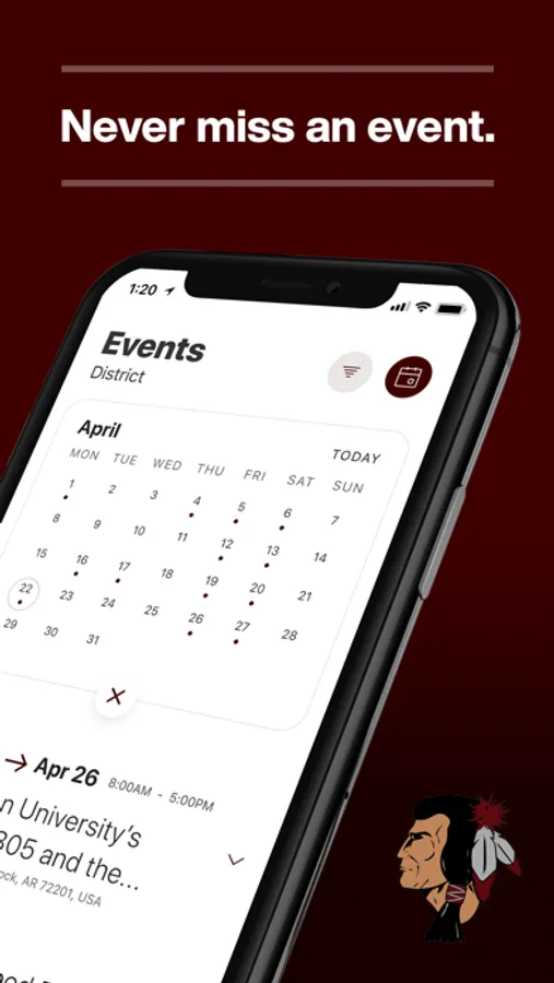 The event section shows a list of events throughout the district. Users can add an event to their calendar to share the event with friends and family with one tap.