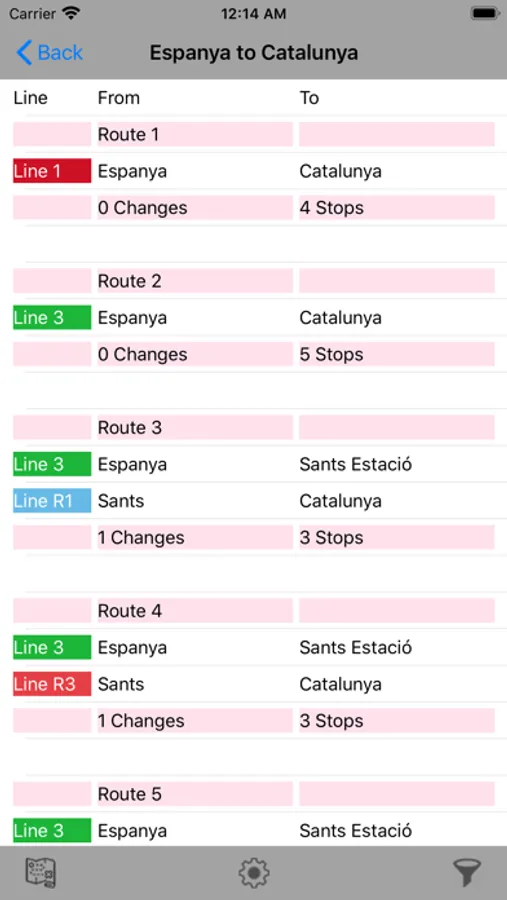 The search provides you with a list of alternative routes which can be used to travel from the source to destination station. It provides you with the number of line changes and station stops involved in each route.