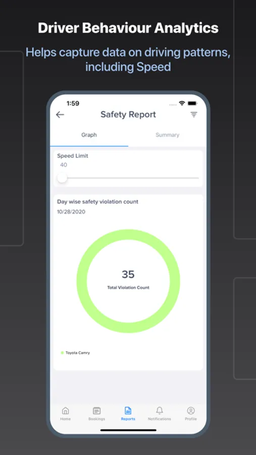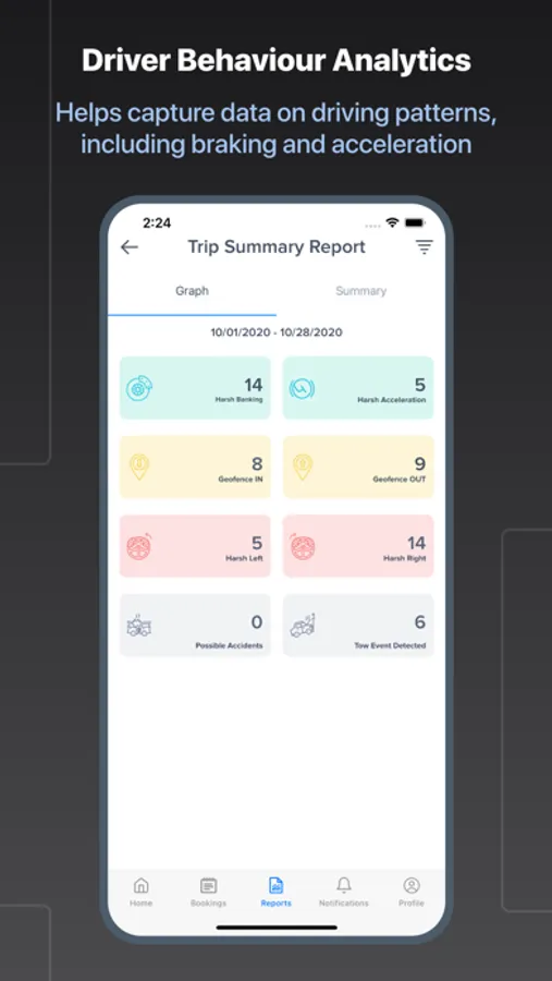 • Driver behavior analytics: Helps capture data on driving patterns, including braking and acceleration, fuel usage, and speed as measured by revolutions per minute (RPM).