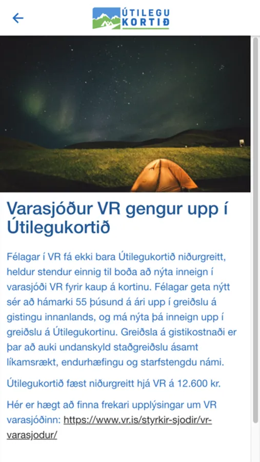 Útilegukortið er þinn ferðafélagi um Ísland. Kortið veitir aðgang að tugum tjaldsvæða um allt Ísland í allt 28 nætur fyrir tvo fullorðna og 4 börn undir 16 ára aldri.